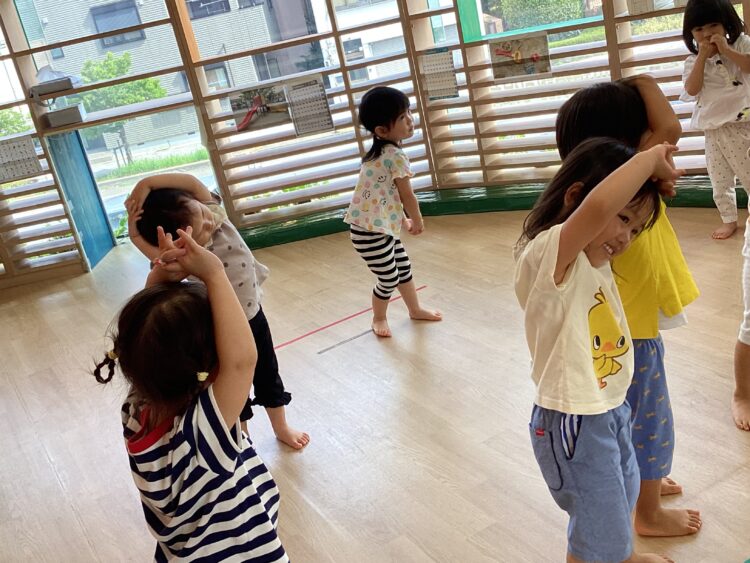 「まげて〜のばす!まげて〜のばす!」と、大きな声で掛け声をしながら準備体操に取り組んでいました😊