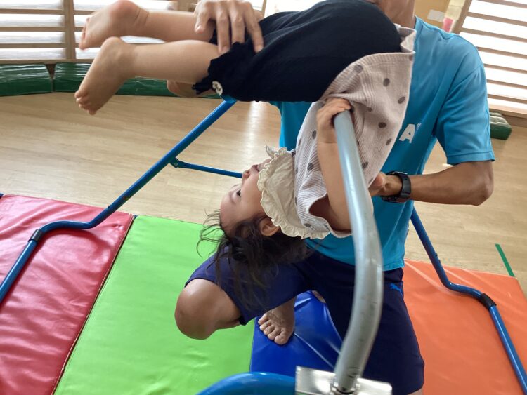 最初は怖がっていたお友だちもいましたが、みんなが挑戦している姿を見てやってみようという気持ちに。回り終わると、保育者とハイタッチして喜び合いました😊