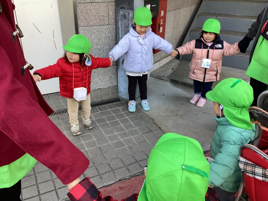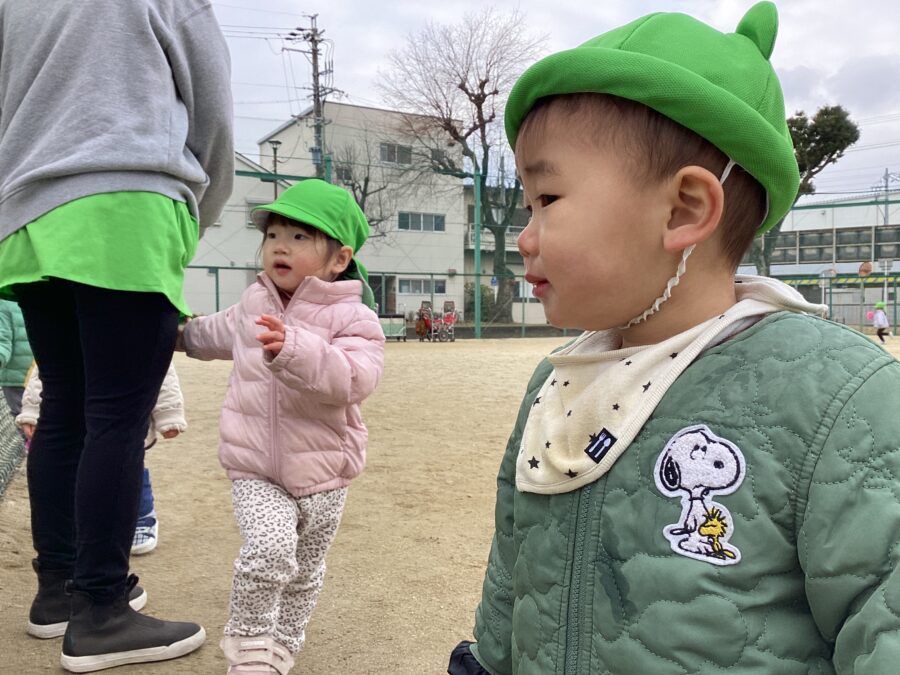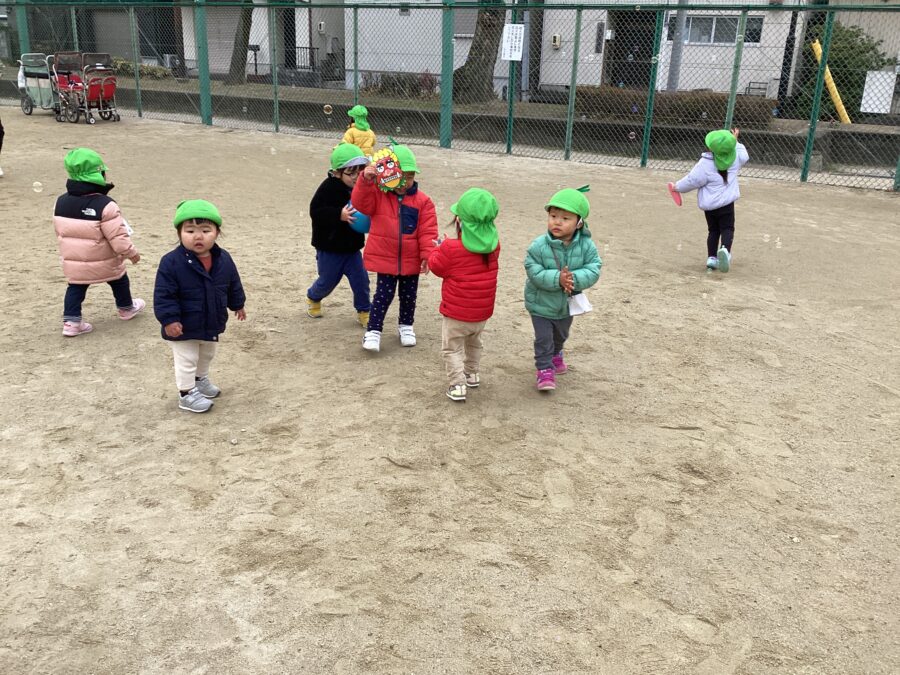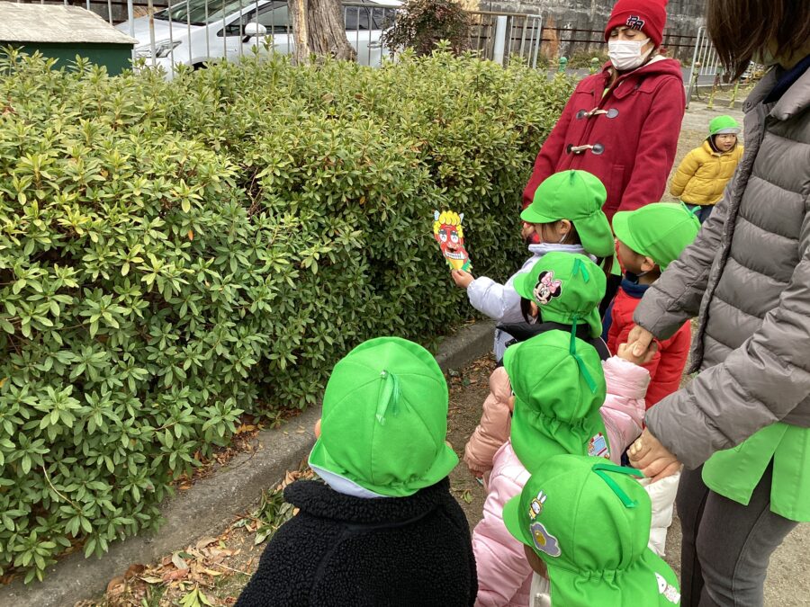帰り道には、オニのお面もかくれんぼしていたので、みんなで「どこかなぁ??」「あっちにかくれているよ」などとお話しながら探しに行きました![]()