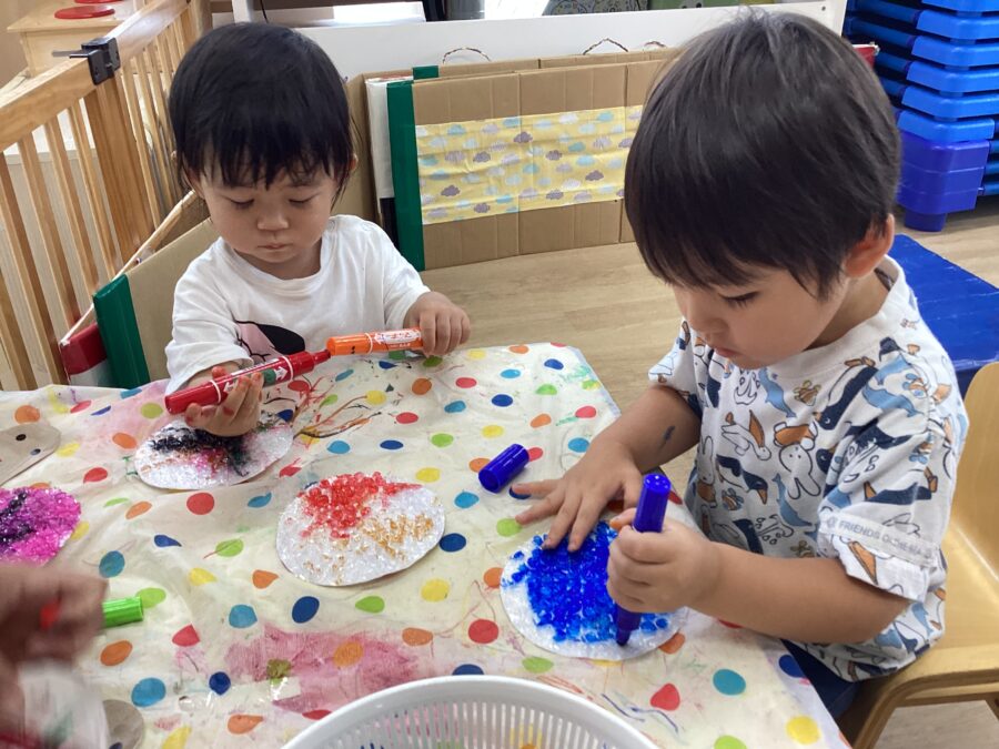 紙とは違ったプチプチの凸凹感を楽しみながら、色塗りを楽しんでいましたよ。