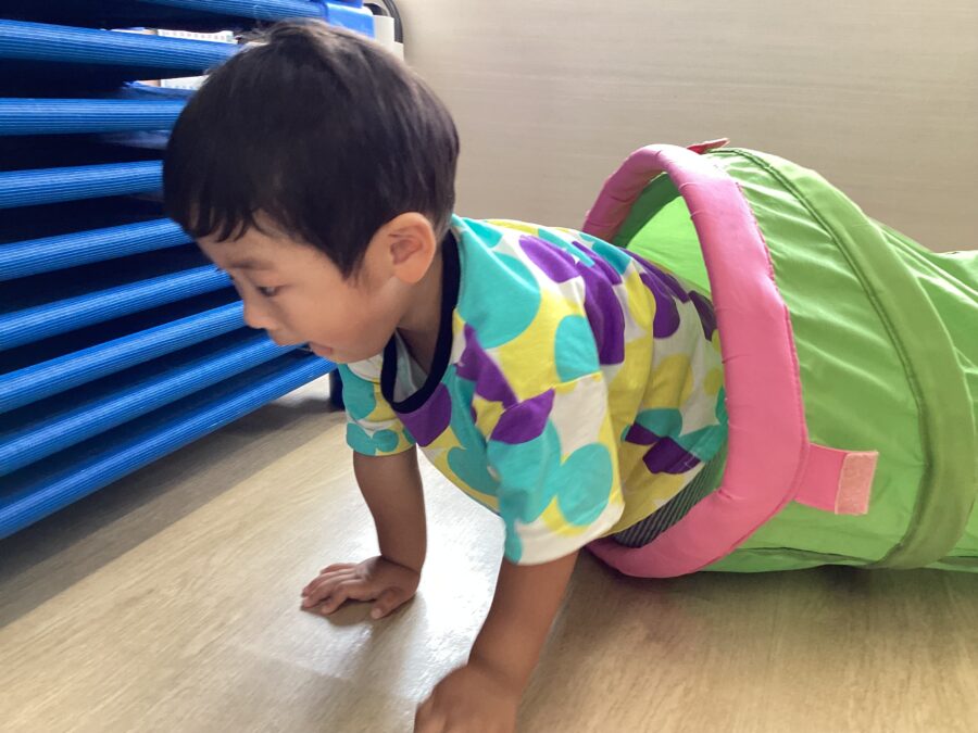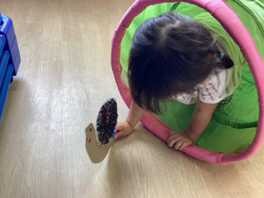「で〜んでん む〜しむし か〜たつむり〜🎵」と歌を歌いながらカタツムリを動かしたり、一緒にトンネルをくぐったり、「滑り台だよ〜」と言いながら壁を滑らせて遊ぶ姿がとてもかわいかったです🩷