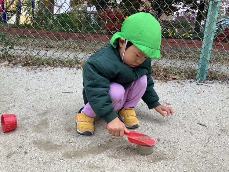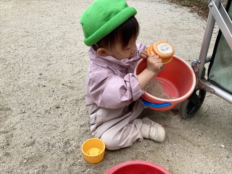 砂の感触を楽しみながらバケツに入れたりするお友だちも😊