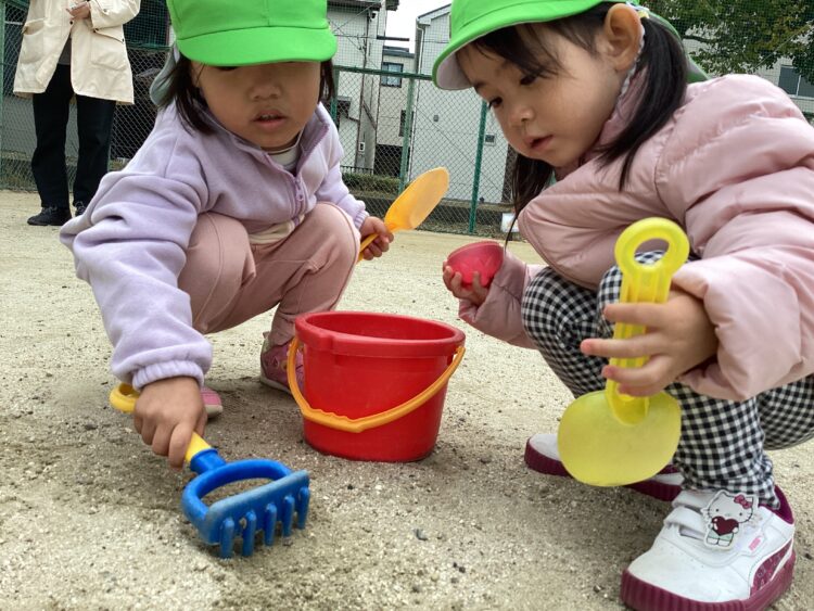 こちらでは協力してバケツいっぱいに砂を入れてケーキ作りをしているお友だちもいましたよ🎂