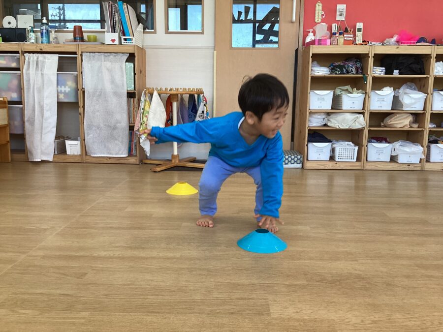「よーい、どん💨」先生の合図で黄色や青色など床に置いてあるコーンを順番にタッチ✋