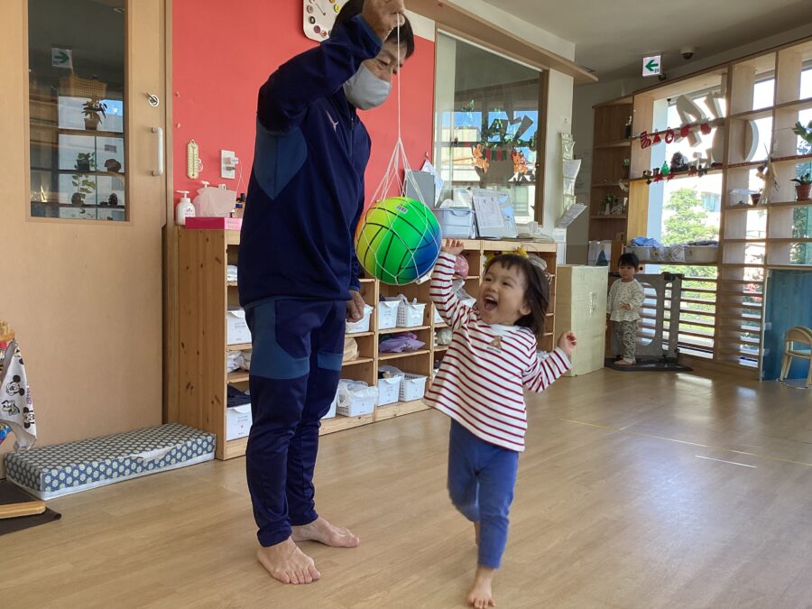 時々先生が、ボールを高い位置に上げるので「わぁ~!」「それ~!!」と思わず声を出しながら勢いよくボールに向かってジャンプする、みんなでした