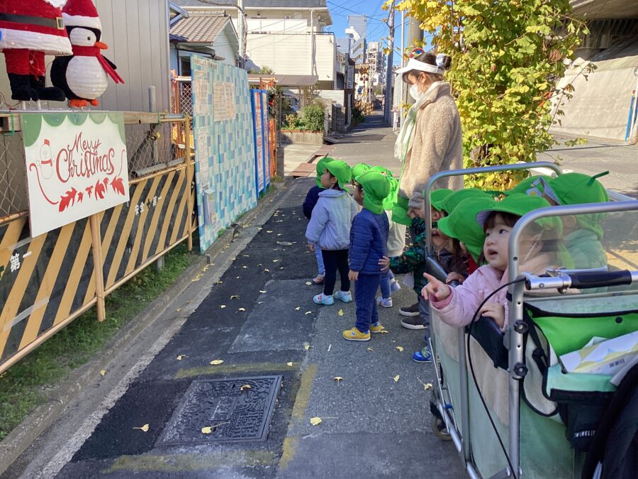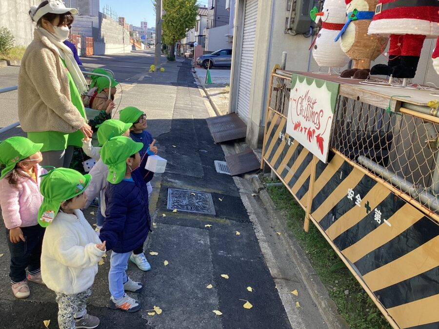 園周辺のお散歩をしていると、大きなサンタさんやトナカイさんたちを発見しました🎄