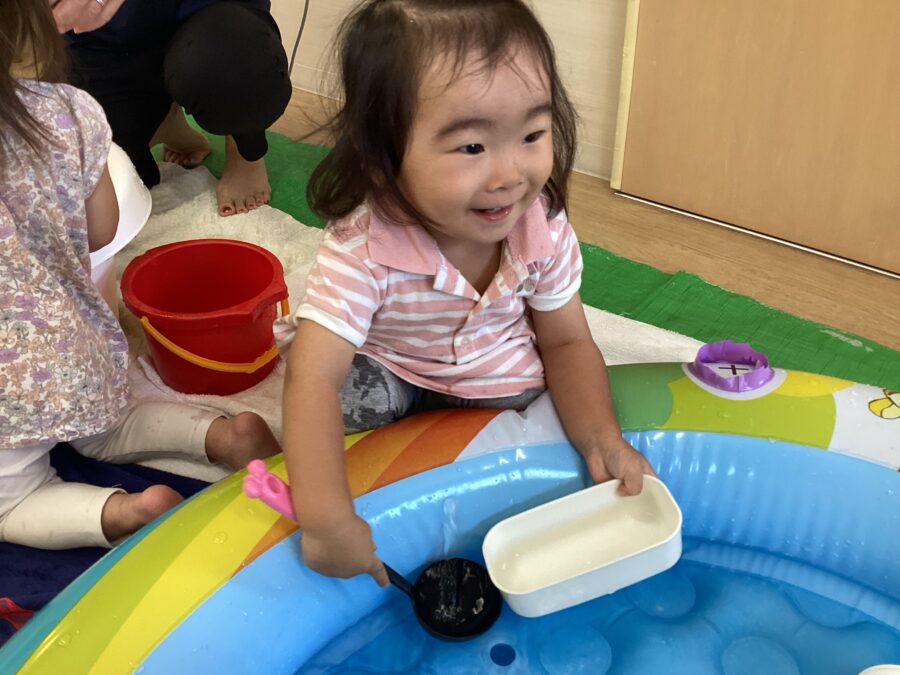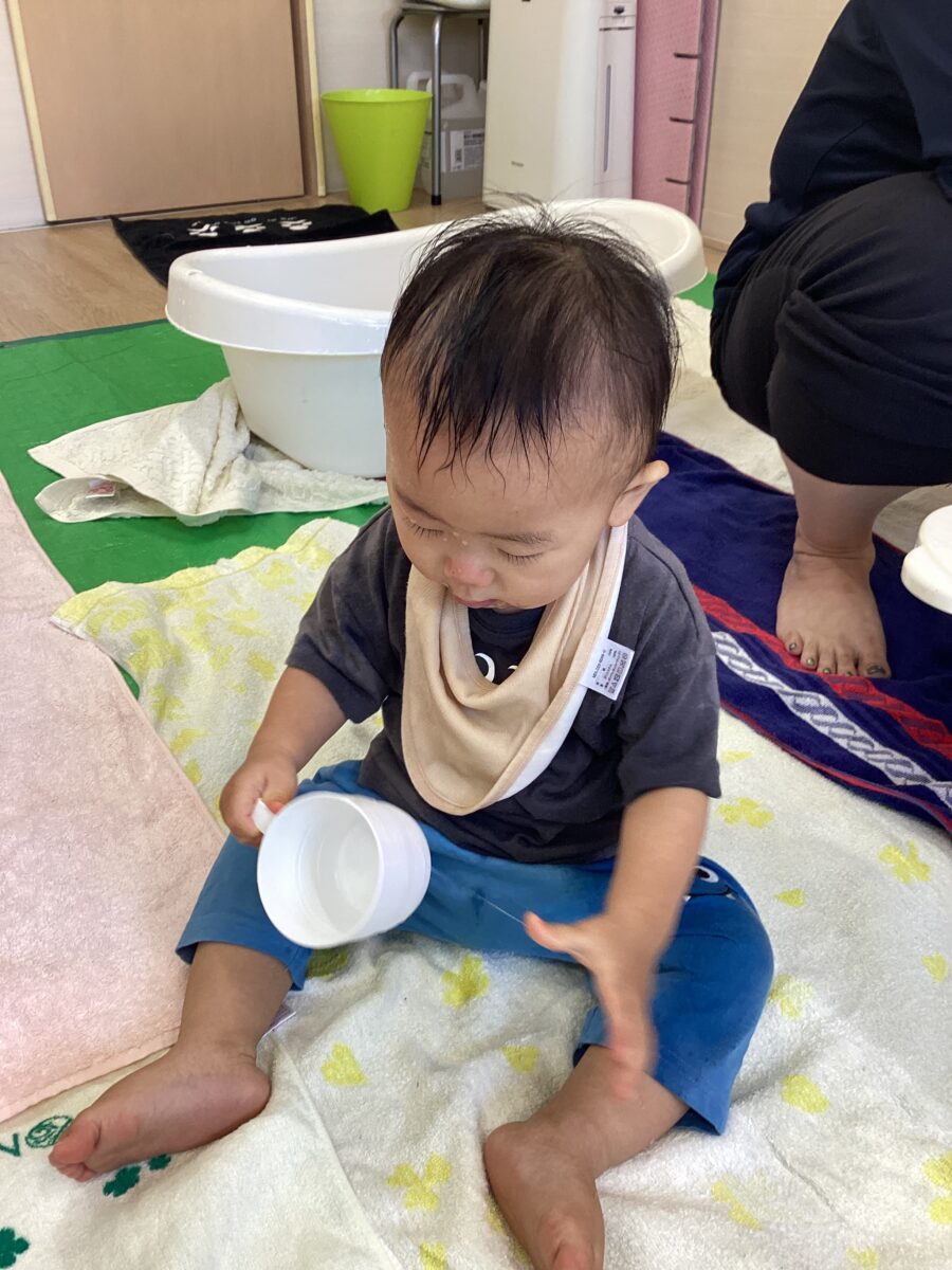 すくったお水が顔にかかってもへっちゃら‼️かかった瞬間はビックリするものの、すぐに笑顔で遊び始めていました🤗