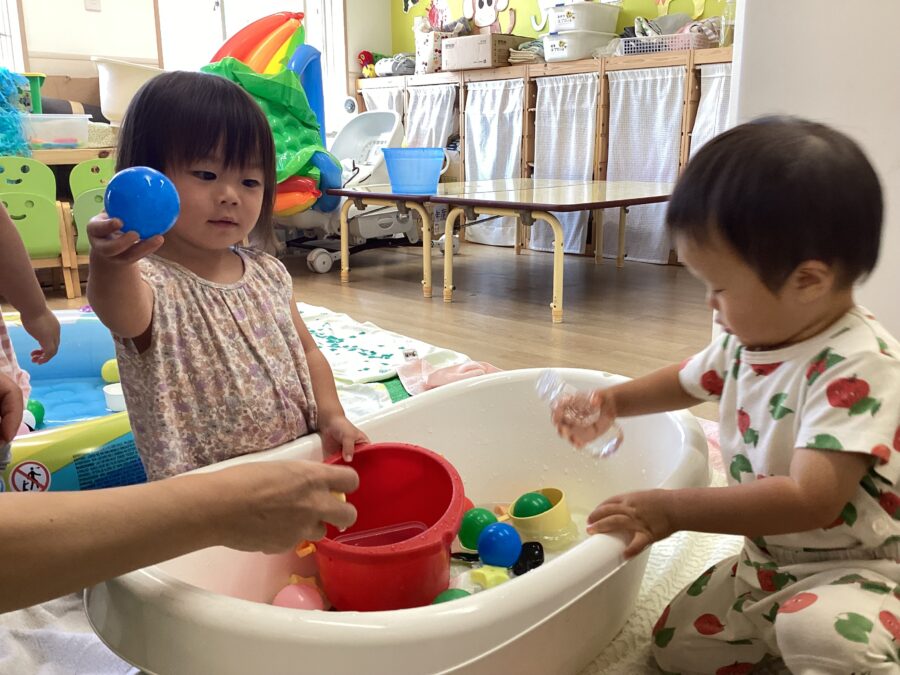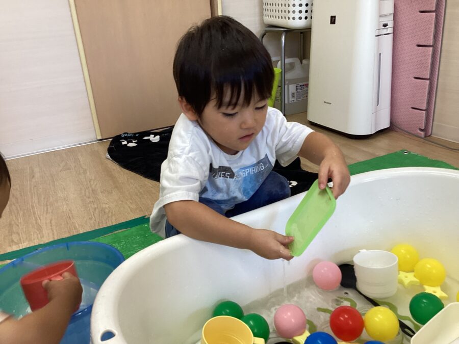 水遊びでは、ボトルを沈めるとブクブク🫧と音をたてて水が入っていく様子を楽しむ姿が見られました😊
