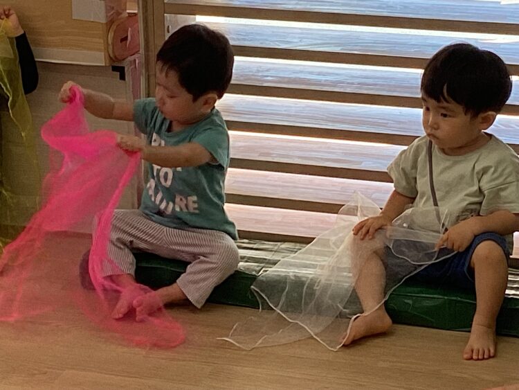 ピアノの高低音、明るい音、暗い音を聞き分けて、頭や膝をツンツンしたり、シフォン布を使ったりして表現しました👆