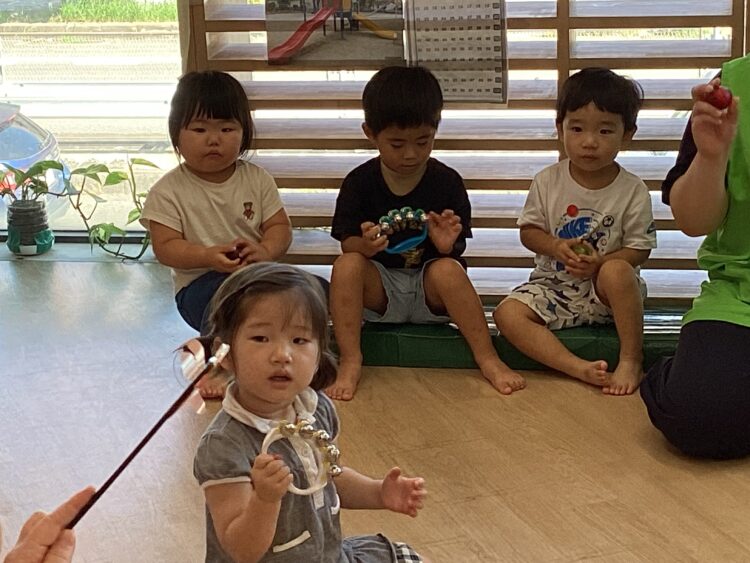 最後はみんなが大好きなエッグマラカスや鈴を使って「とんぼ」の曲に合わせて合奏をしました🪇
