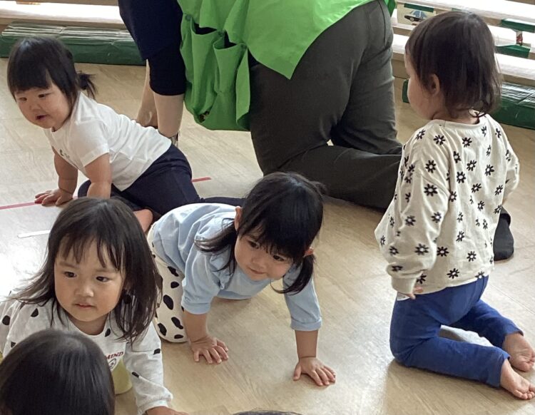 ダンゴムシになりきってお散歩しました😄「みてみて!早いでしょ〜」と早くハイハイしたり、ゆっくりハイハイしたりして、自分なりにダンゴムシを表現しながら楽しんでいました🙌