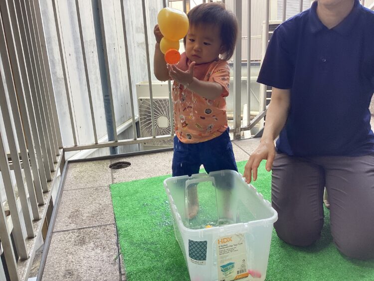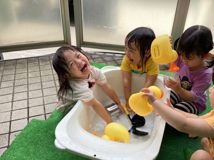 保育者がジョーロで雨を降らせると、真似して「ジャー!雨だよ〜」と一緒に雨を降らせる子や、「きもち〜」と水にかかりにくる子など、様々なあそび方で水に触れることを楽しんでいました🙌