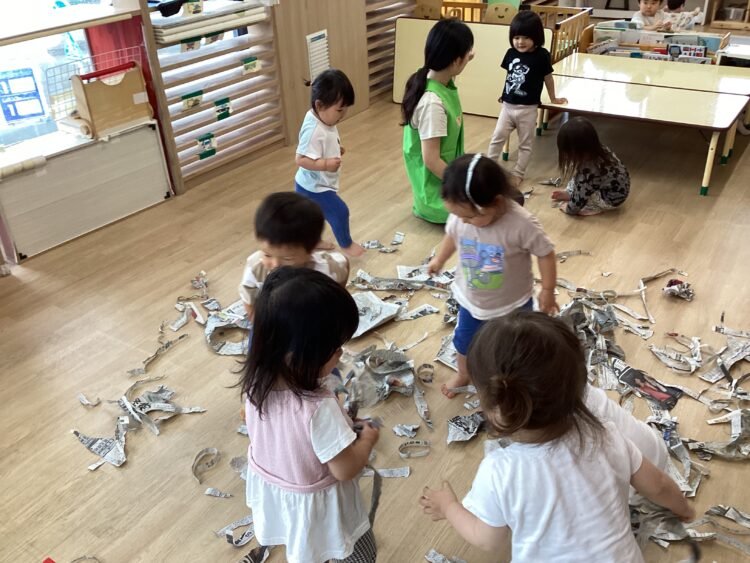 今日は室内で過ごしました。新聞紙をビリビリと破っていると、「なにしてるのー?」「〇〇もやるー!」と興味津々できてくれました😄