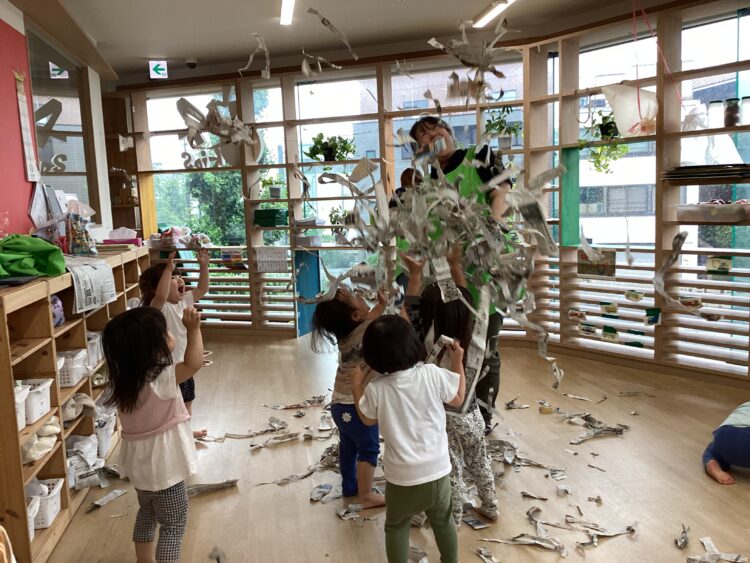 落ちてくる新聞紙を見て「きゃ〜✨」「もう一回やって!」と楽しんでいましたよ🎵