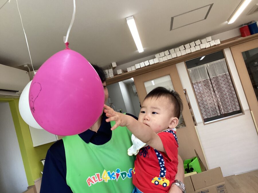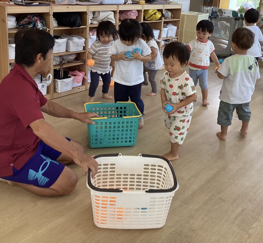 今日はカラーボールを使って、色分けゲームをしたり、投げてカゴに入れる遊びをしました。