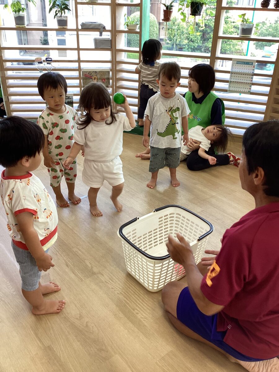 ポイッと投げて見事カゴに入るとニコニコっと保育者の顔を見て満足気な子どもたちでした😄👏