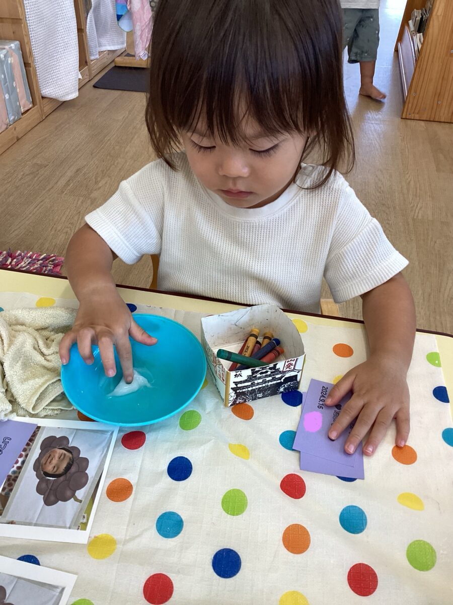 水色は青いカゴ、オレンジは白のカゴと教えてもらい、色を見て考えながら入れる姿が見られました👀