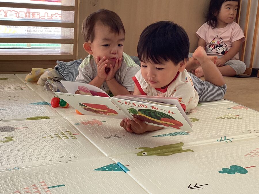 保育者や友だちと一緒に絵本を見ながら「どれがいい?」と会話のやりとりを楽しむ姿が見られます😄
