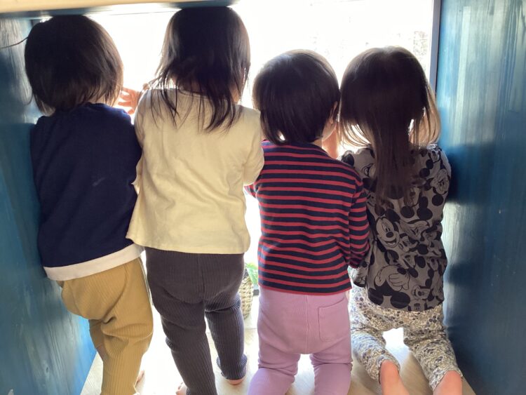 「あ!○○くんだ!!」と3月まで一緒に過ごしたお友だちがお外を歩いているのを見つけるとみんなで、出窓から手を振っていました![]()