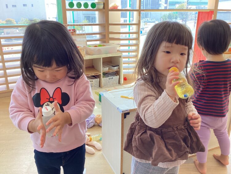 オモチャのジュースをマイクに見立てて、ノリノリでアンパンマンの歌を歌うお友だち
