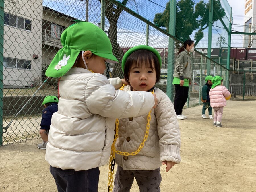 しっぽ取りをしていると、しっぽの洗濯バサミに夢中になるお友だちを発見🤭