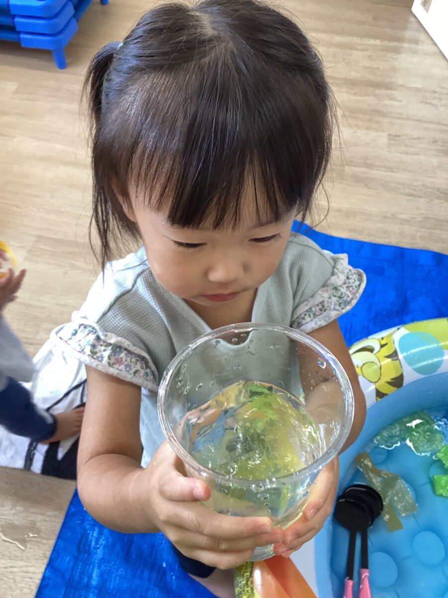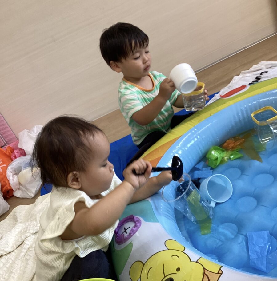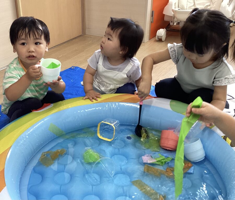水遊びはいろいろな色のカラービニールを入れて、ミックスジュースを作ったり、カップに注いだりして遊びました。