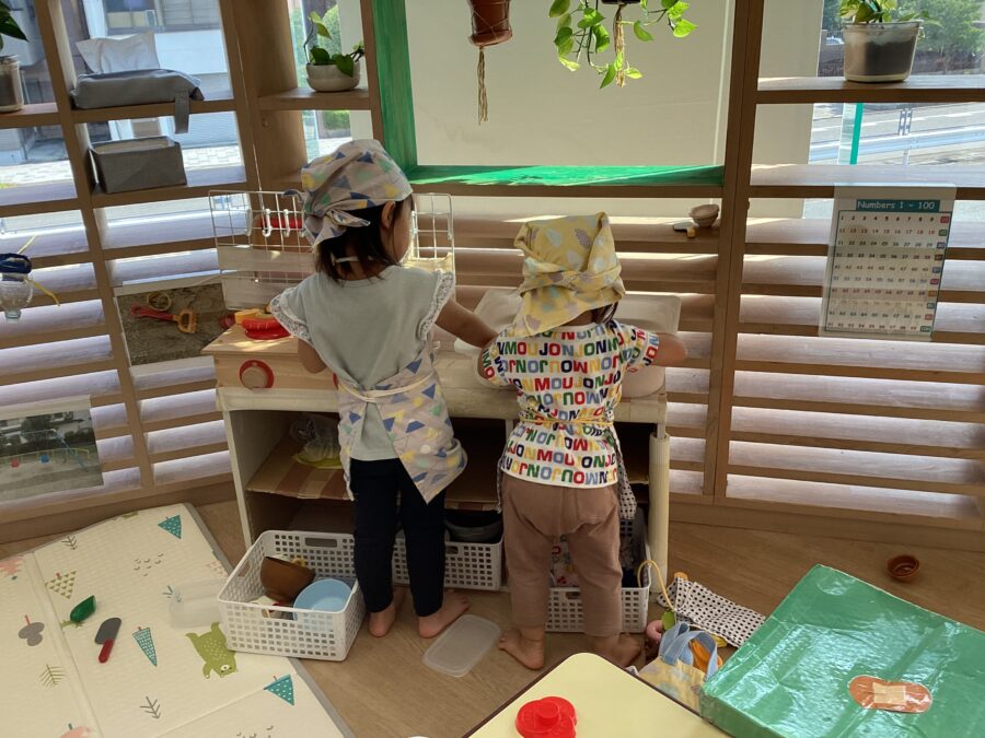 エプロンと三角巾をつけて仲良く遊ぶ後ろ姿に、ほっこり🩷