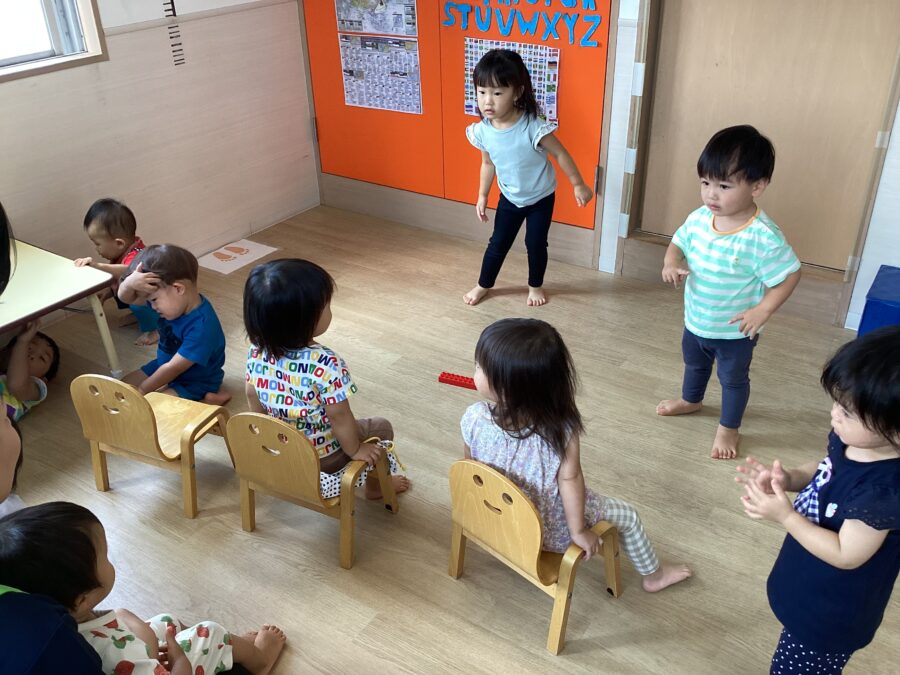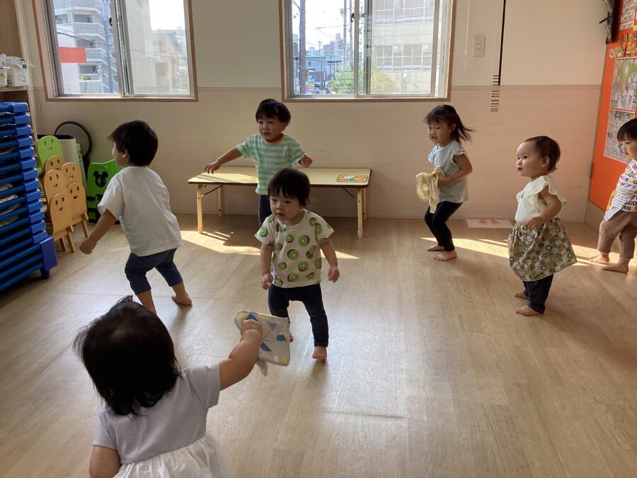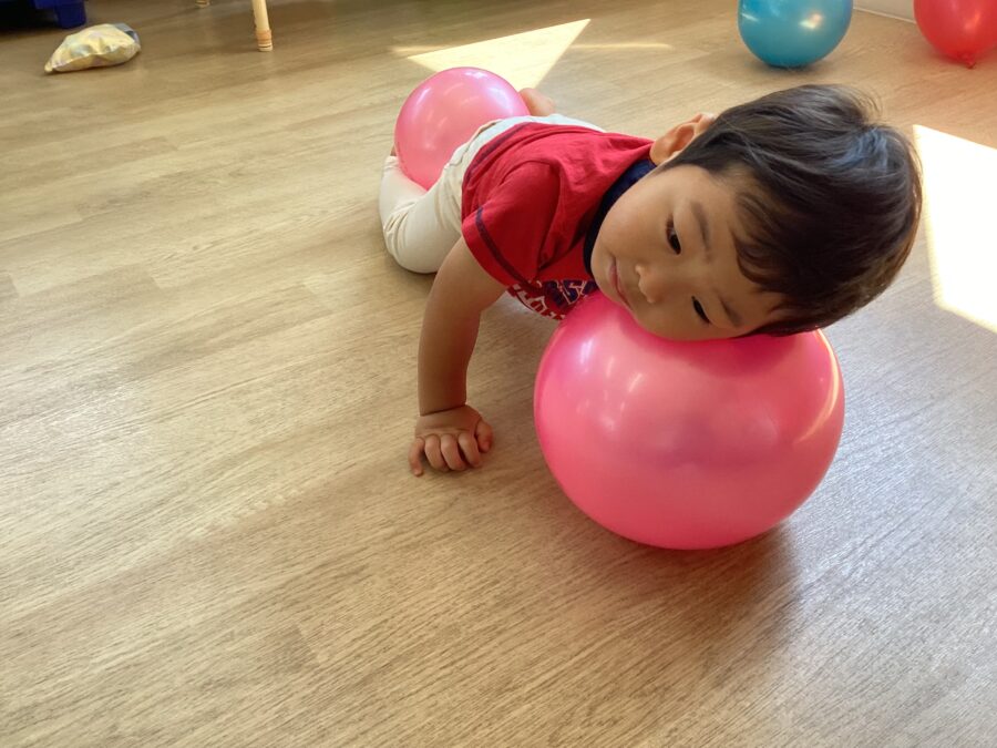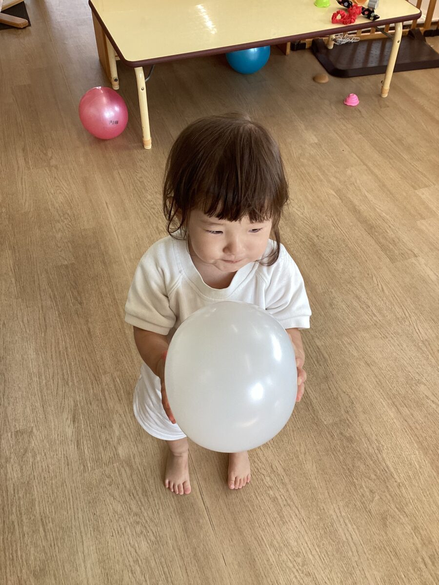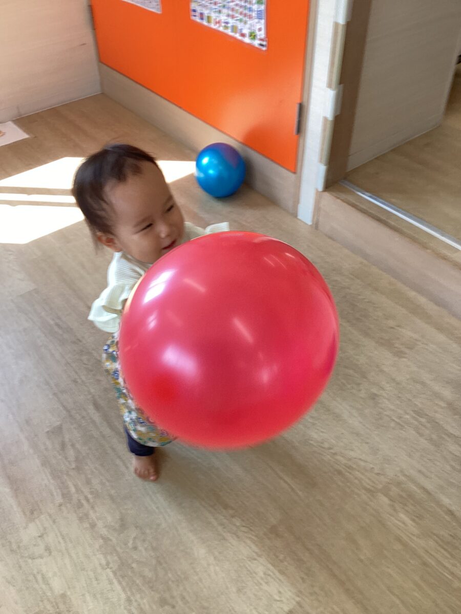 「あお!」「パープル!」と風船の色の違いに気づいたり、ふわふわと飛んだり落ちたりする風船を捕まえて楽しみました。