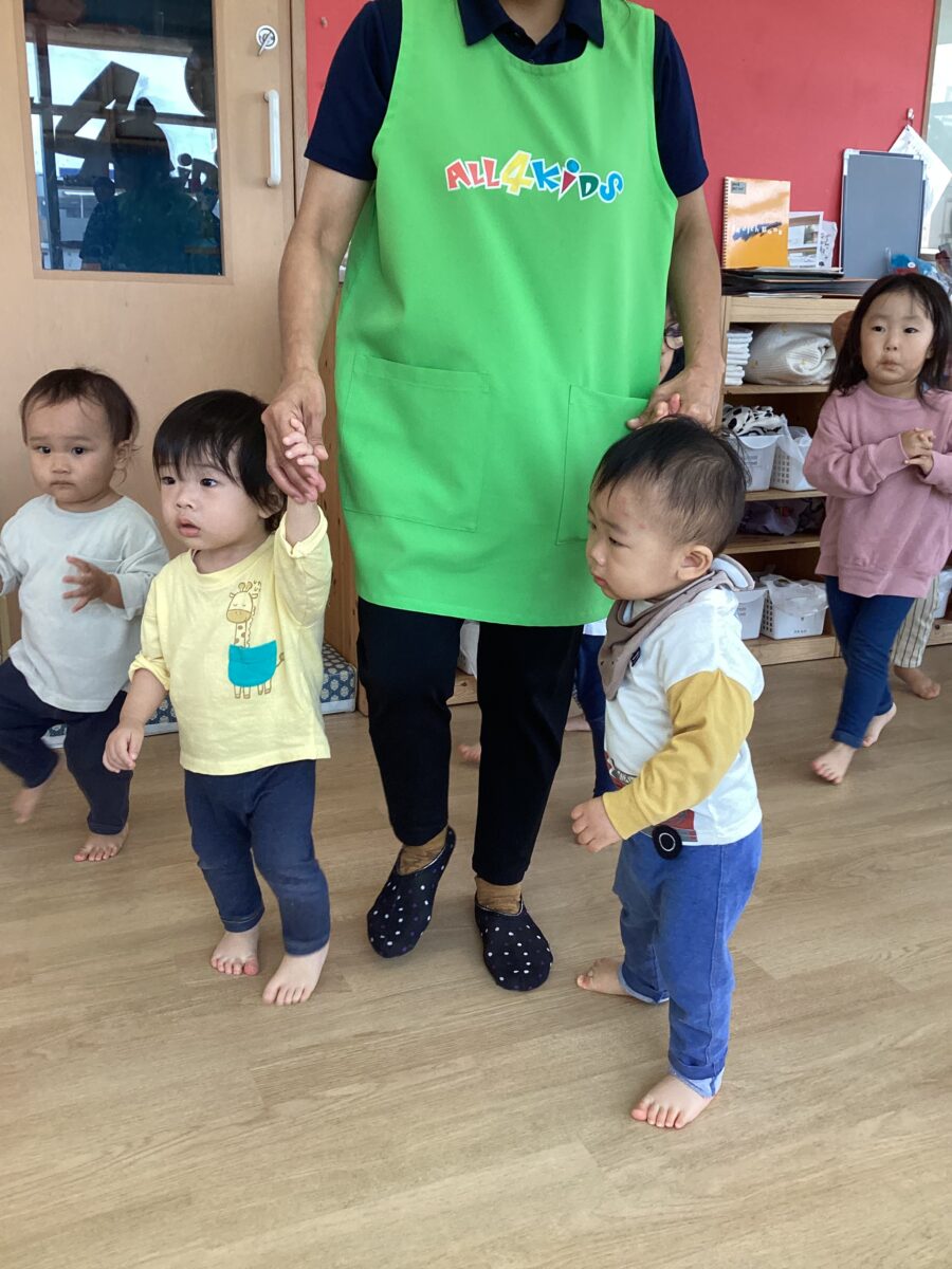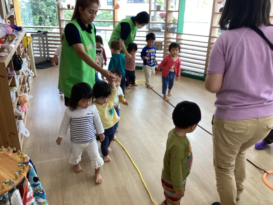 リズムに合わせて歩いたり、止まったりと初めてのリトミックを楽しんでいましたよ。