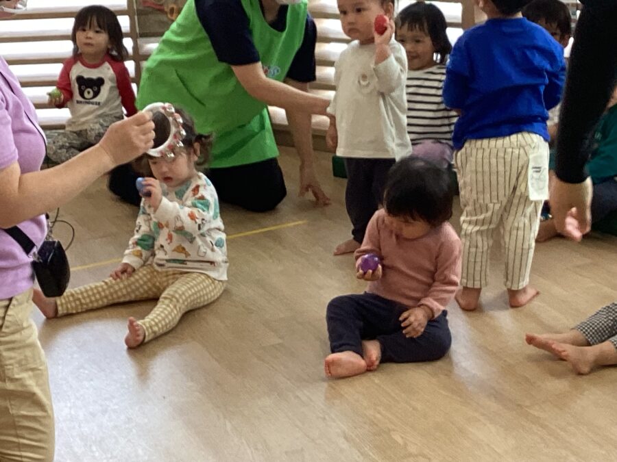 「山のおんがくか」の歌に合わせて、鈴やマラカスでリズムをとると、自然と体もゆらゆら🎵