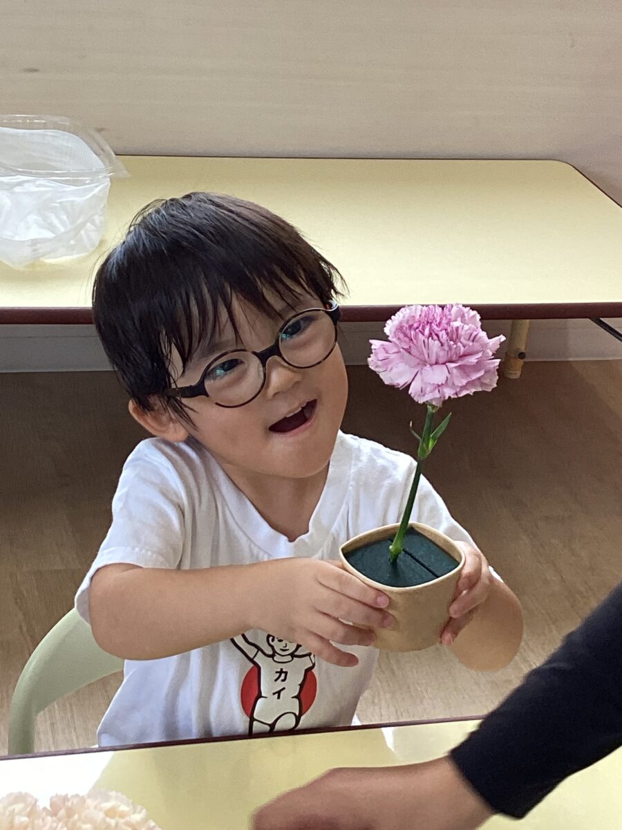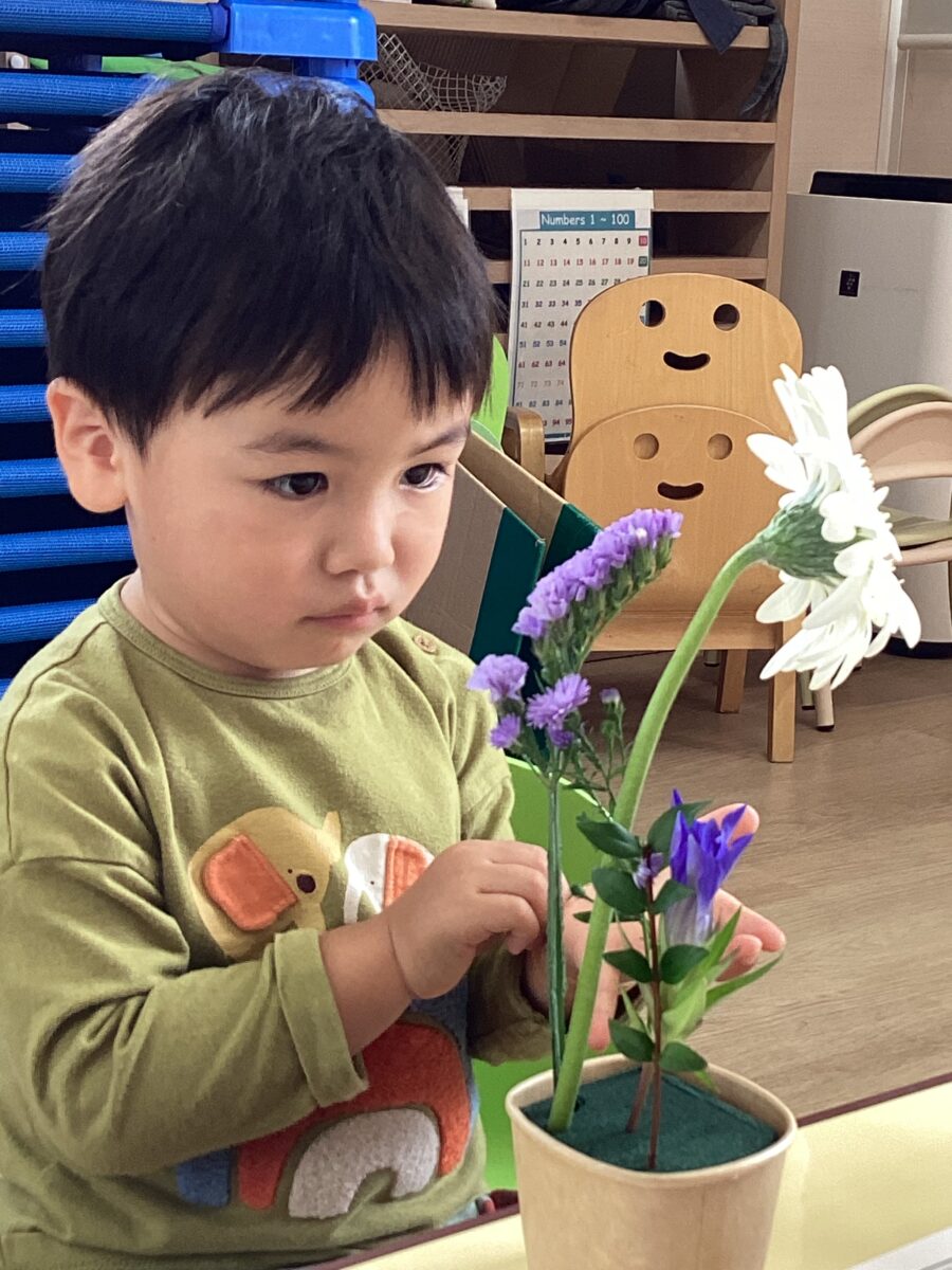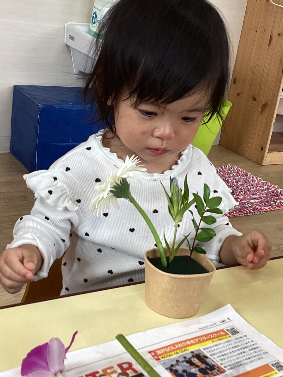 「パープルだ!」「〇〇ちゃんはこれにする!」と好きな花を選んで、積極的に生けていましたよ👏