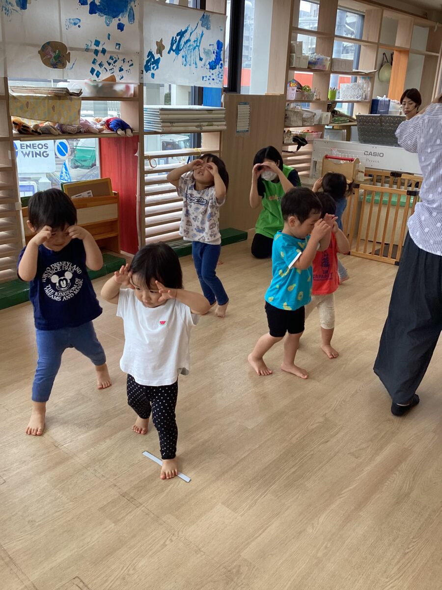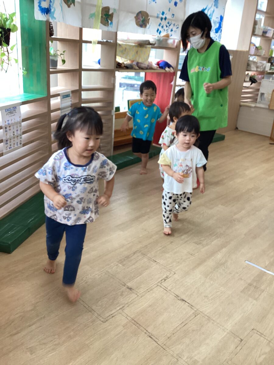 始めは音楽に合わせて行進したり、走ったり。。音が止まるタイミングでピタッと動きを止めるのも、お手の物になってきましたよ✨