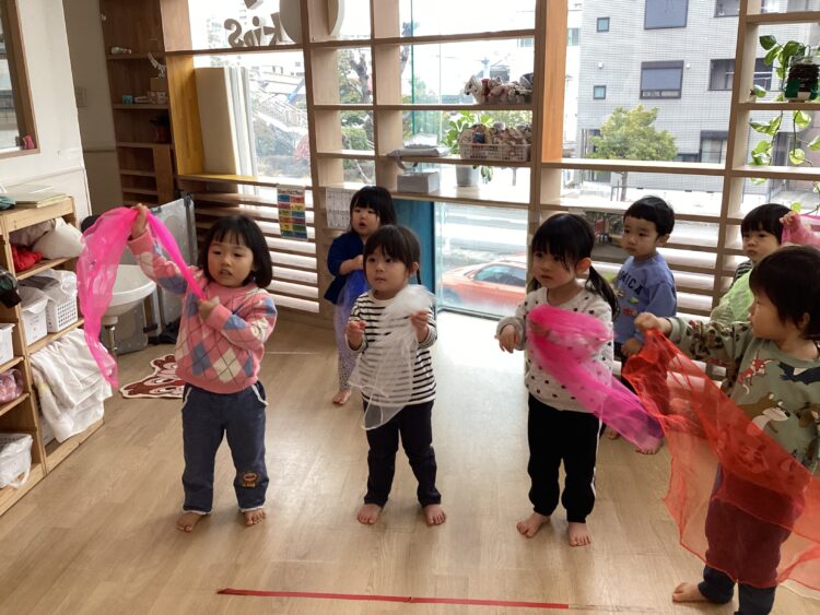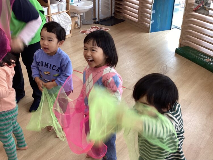さて、前回同様シフォン布を使って、お餅や凧に見立ててあそびましたよ!