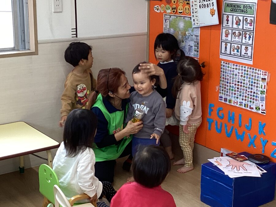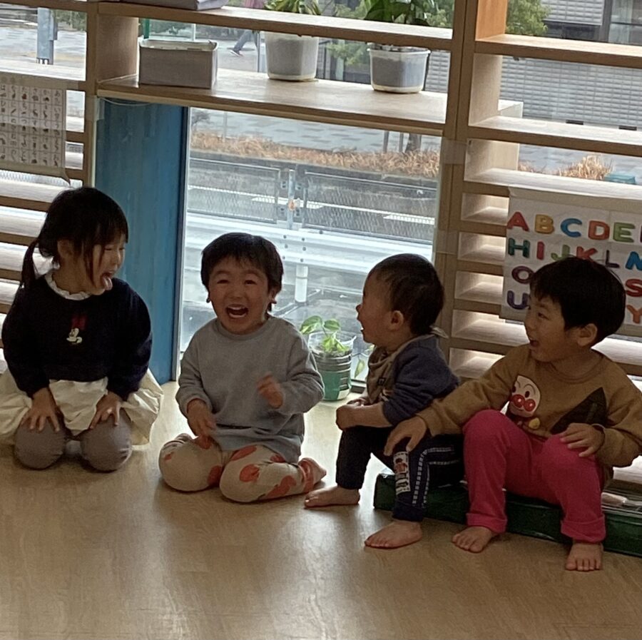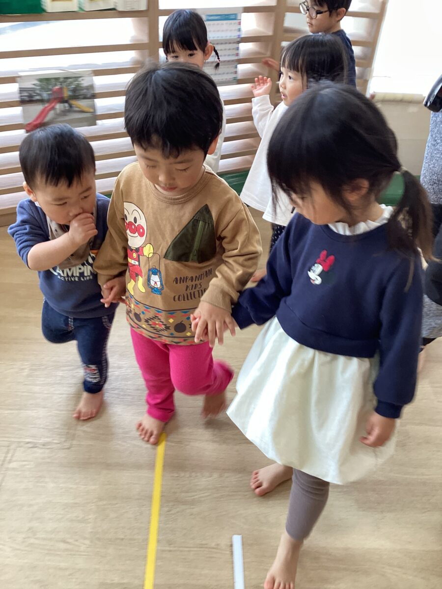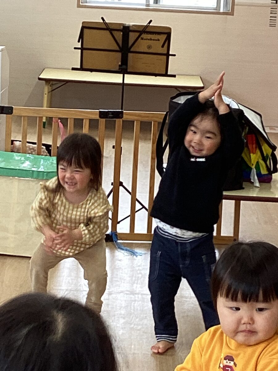 音楽に合わせて遊んでいると、だんだん楽しくなってきて、お友だちと顔を見合わせてニッコニコ😄