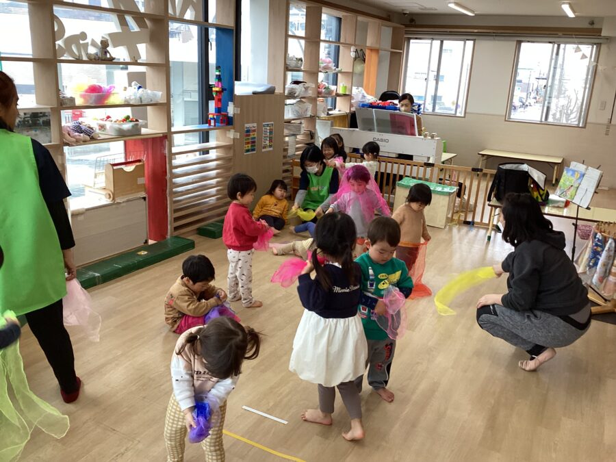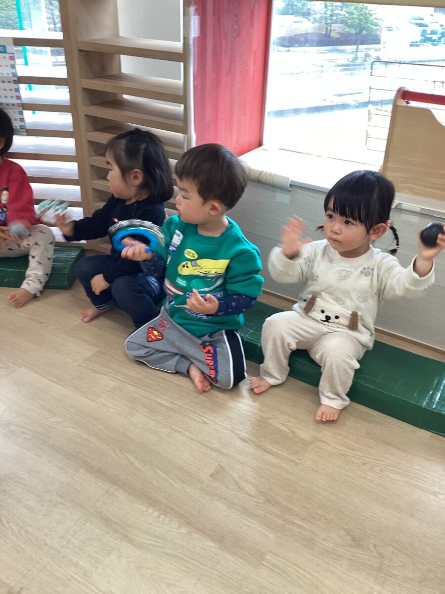 春を感じる曲や言葉に合わせて、体を動かしたり、リズム打ちをしたりして遊びました。