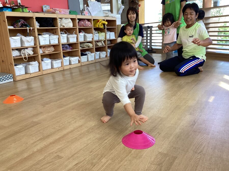 「よーい、どん」の合図でオレンジ→ピンク→先生の順番にタッチしていきました![]()