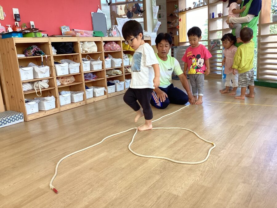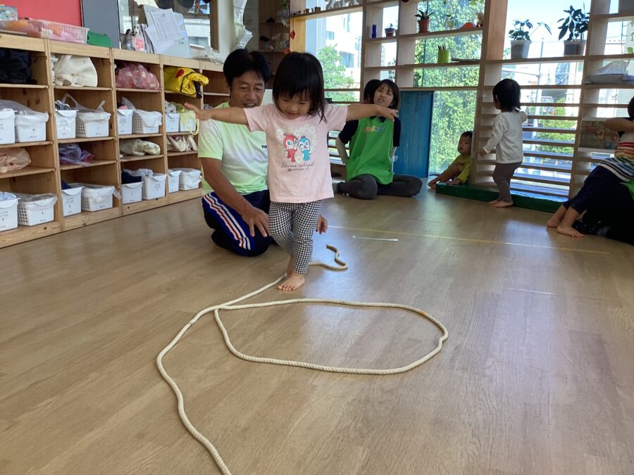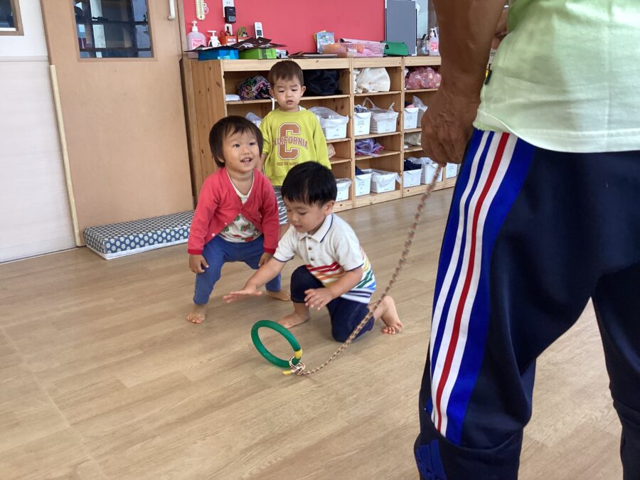 最後は、先生がもつロープの先に繋がっていた、輪っか掴みゲームをしました!