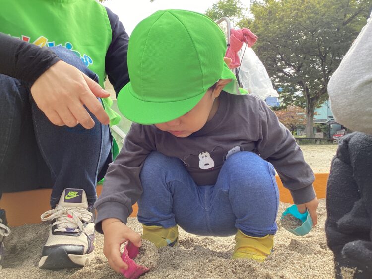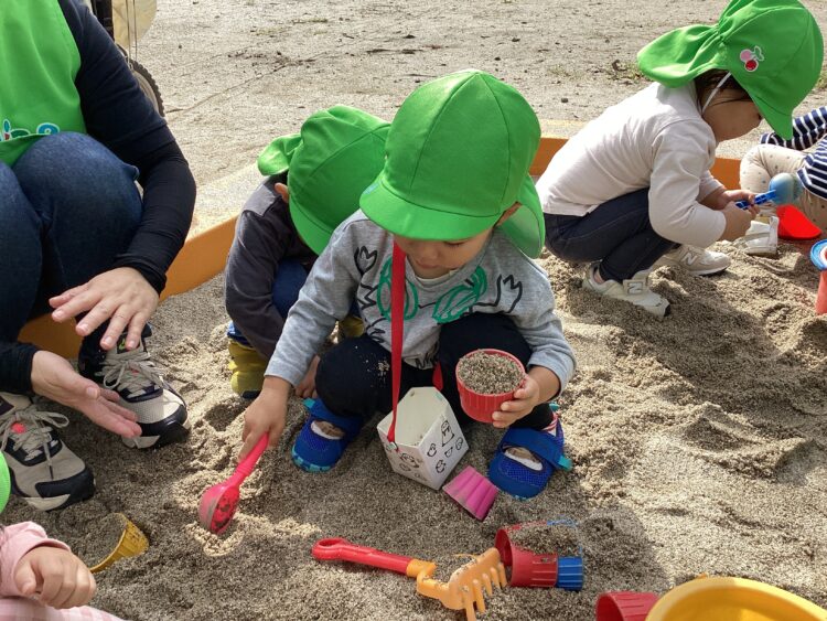 ザラザラした砂の感触を楽しみながらバケツ一杯に砂を入れたり、型抜きをしたりして楽しんでいました😄