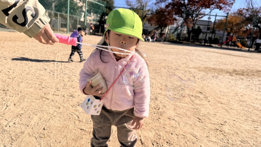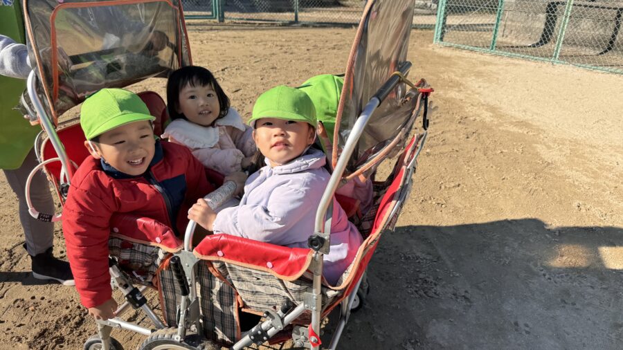 シャボン玉や砂遊びも人気でしたが、今日は「カート」に乗りたい!とリクエストがあり、先生に押してもらってグラウンドを何周も回っていました🚙