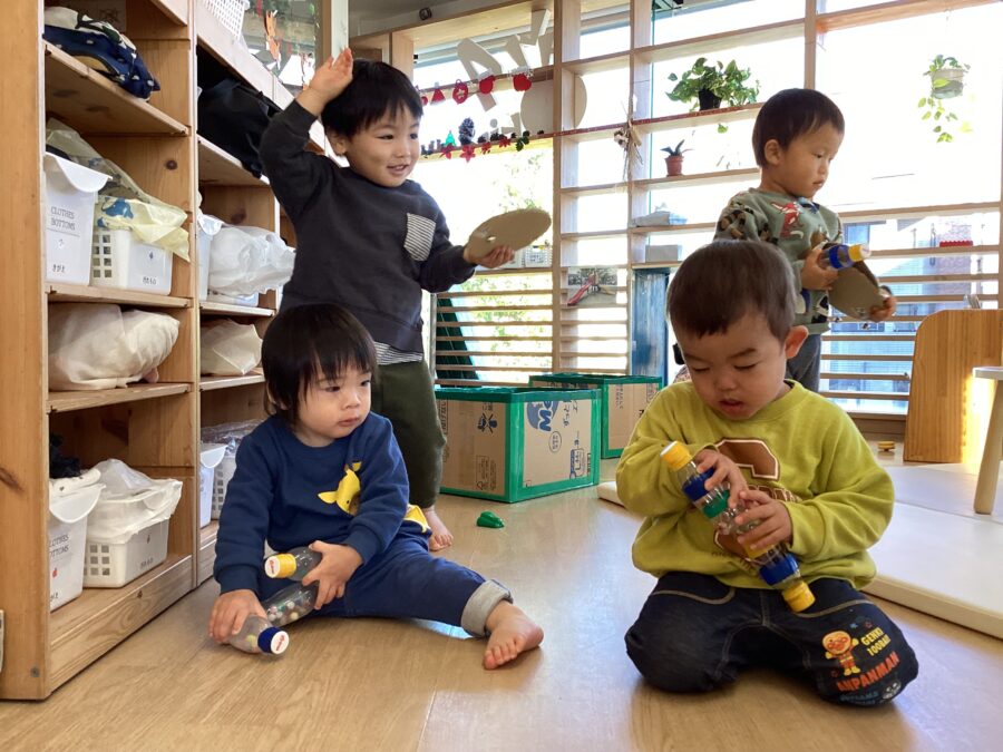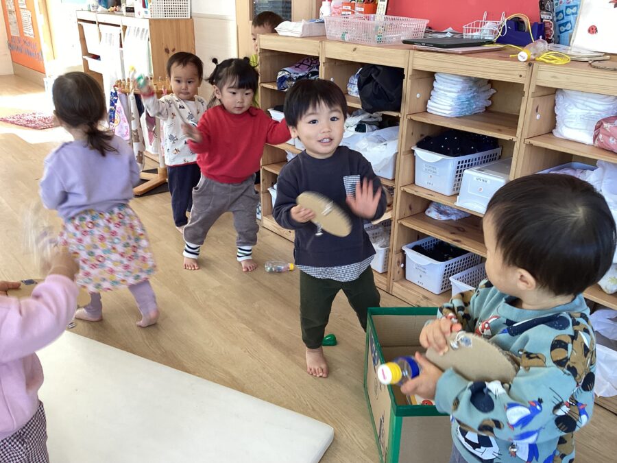 自分たちで玩具のマラカスやタンバリンを見つけて、ノリノリでした🎵
