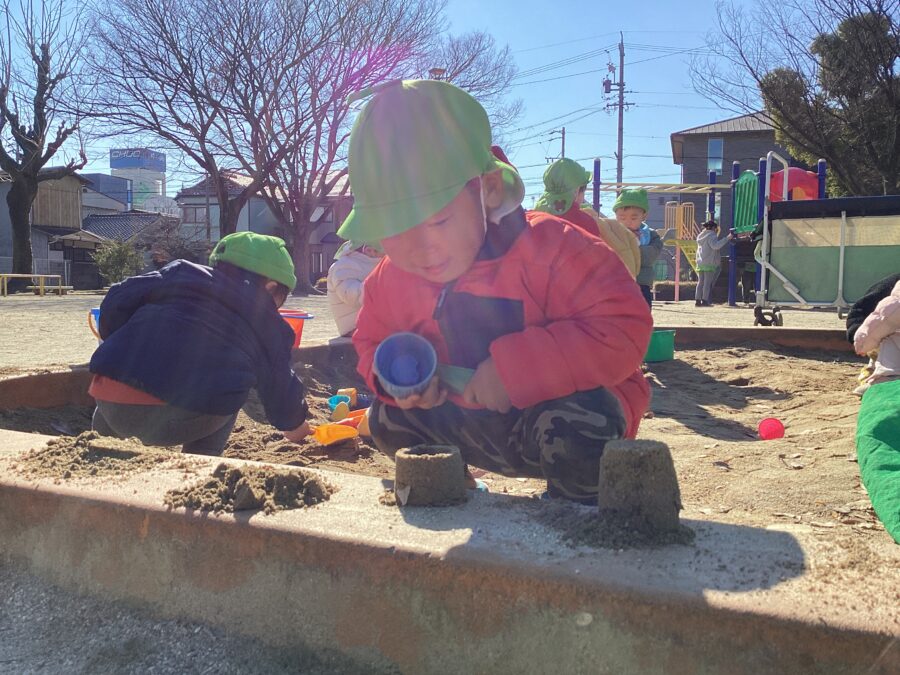 砂遊びではスコップを使って、上手に砂をすくい、ごはんやケーキを作っていましたよ🧁