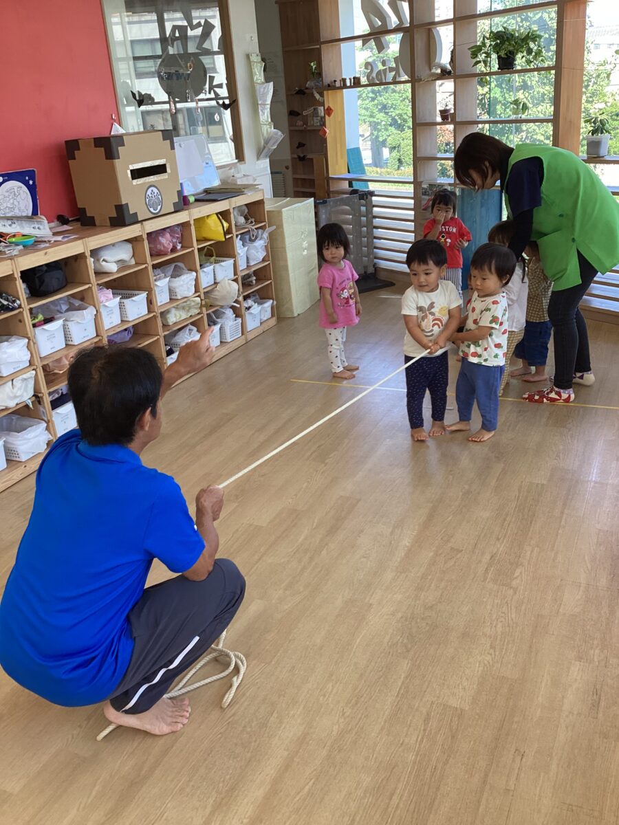 「ピーピー後ろに下がります~」と保育者の言葉を聞いてみんなで持ったロープを上手に後ろに運ぶことができました👏