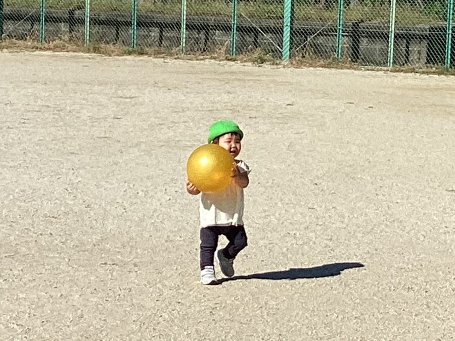 お外にお散歩に行ったお友だちは、自分の体ほどの大きなボールを上手にもって運んだり、