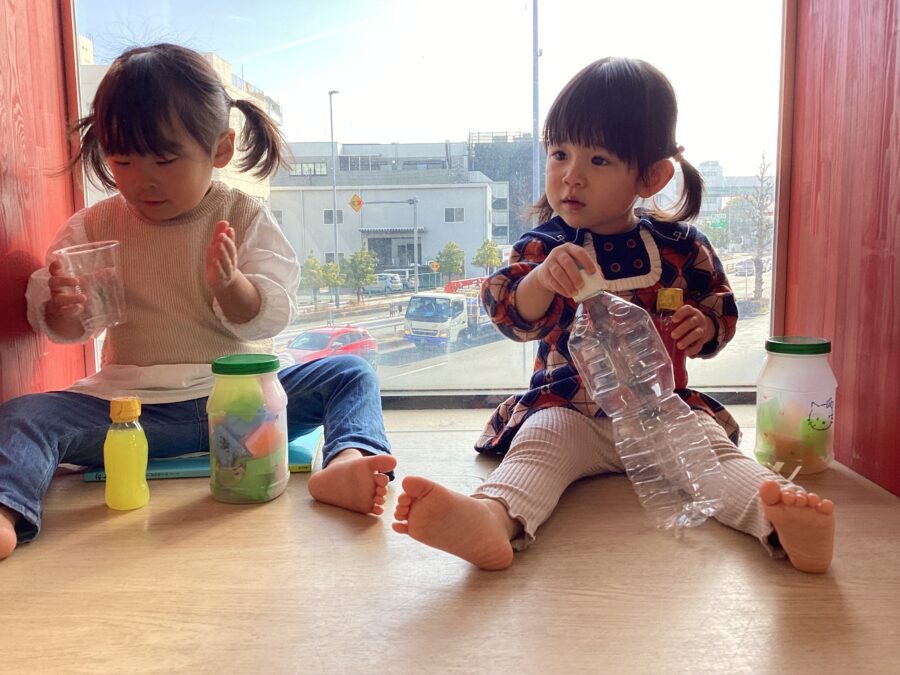 カラービニールを透明カップに入れて、「オレンジジュースだよ🍊」「これはパイナップルだよ🍍」といろいろな味のジュースを作って楽しんでいましたよ。