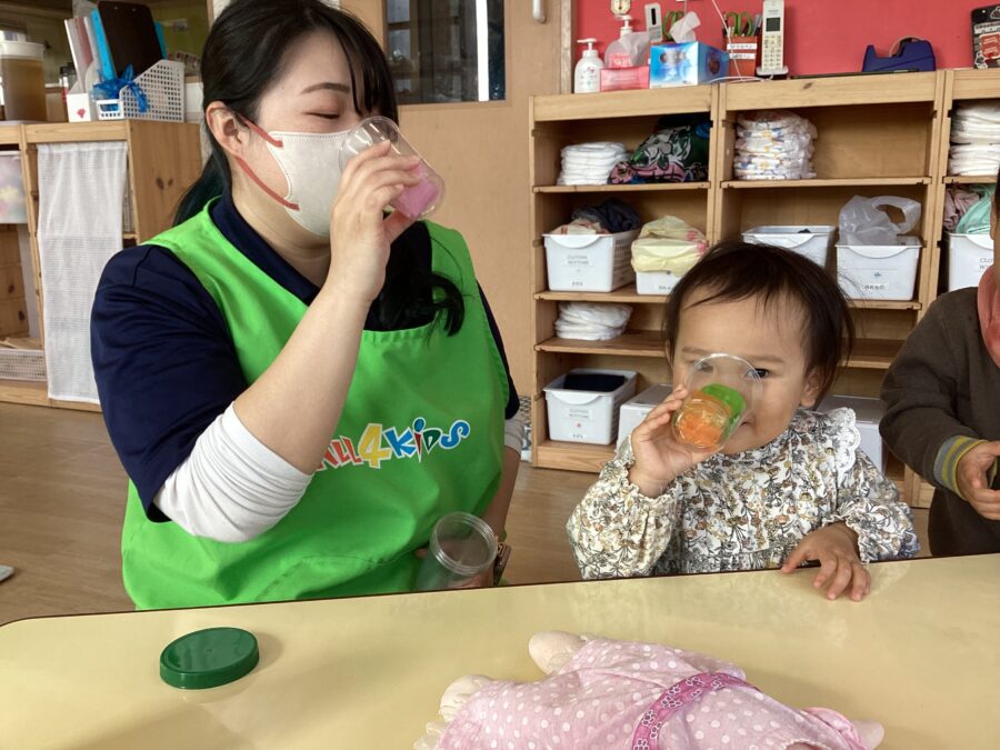 保育者に作ってくれると「かんぱ〜い🥂」と言って、ジュースパーティーが始まりました☺️お人形さんも連れてきて、ニコニコでパーティーを楽しんでいましたよ✨