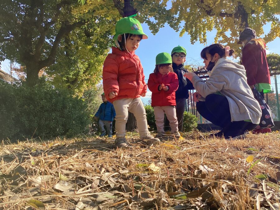 落ち葉の上を嬉しそうに歩きながら、「黒いドングリだ!」「かたつむりだ!(←見てみるとどんぐりの帽子でした😂)」と色々な発見を楽しんでいましたよ✨