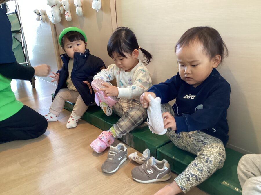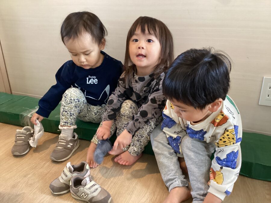 自分でできることが嬉しく、一生懸命靴下を履いて準備していました👏
