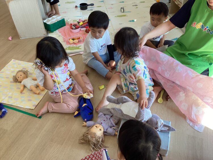 お人形を患者さんに見立ててお医者さんごっこが盛り上がっています🧑⚕️