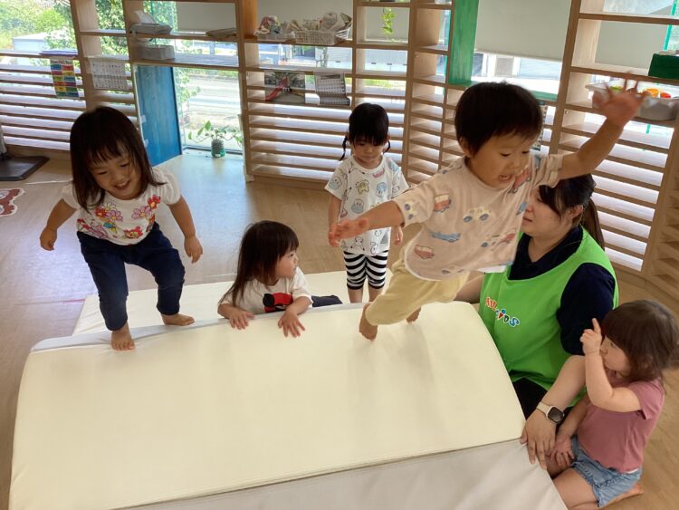 マットの山からジャンプしたりして身体を動かすことを楽しむお友だち😊