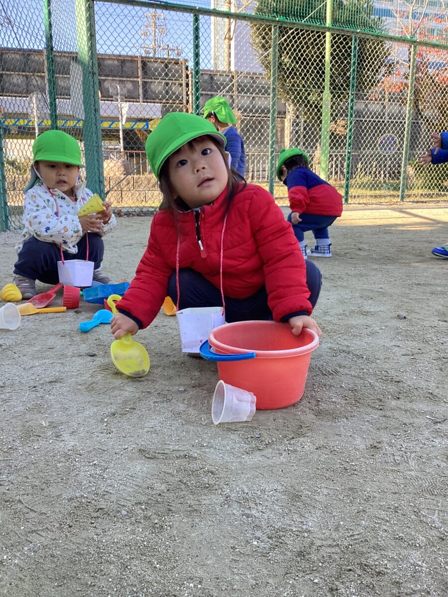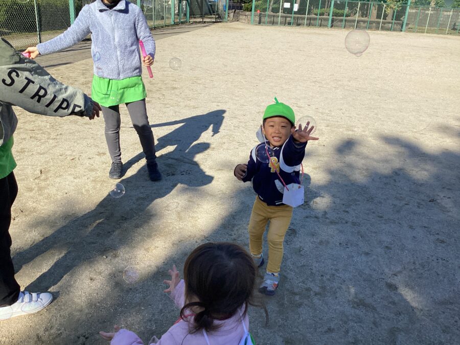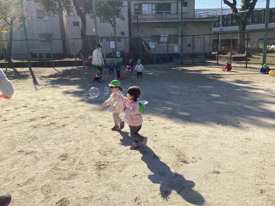 お砂あそびや、シャボン玉、ボールあそびと自分たちの好きな遊びを見つけて元気な声が飛び交っていました🎵